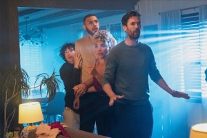 几个人聚到房间的照片墙旁边